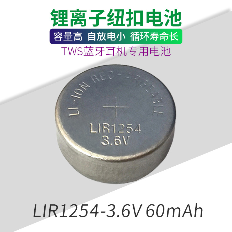 真明LIR1254紐扣電池是一款3.6V可充電鋰離子紐扣電池,電池容量60mAh,最大放電倍率2C。??同時它也是一款?的藍牙耳機?專用?電池,常用于TWS藍牙耳機。