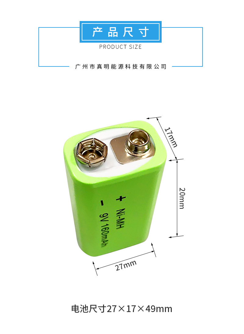 尺寸大小:跟一次性電池6F22、6LR61規格尺寸相同。