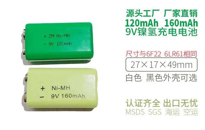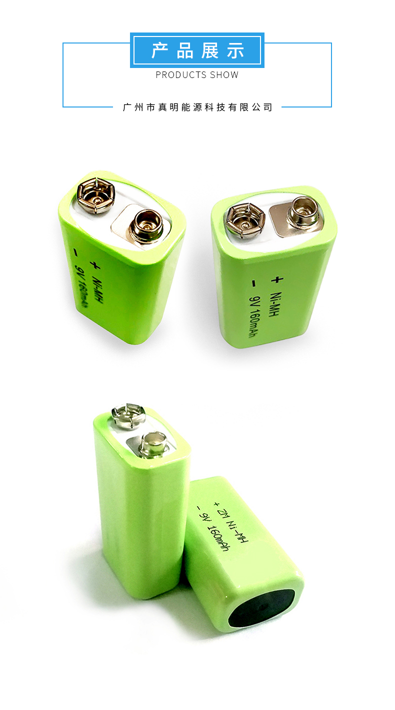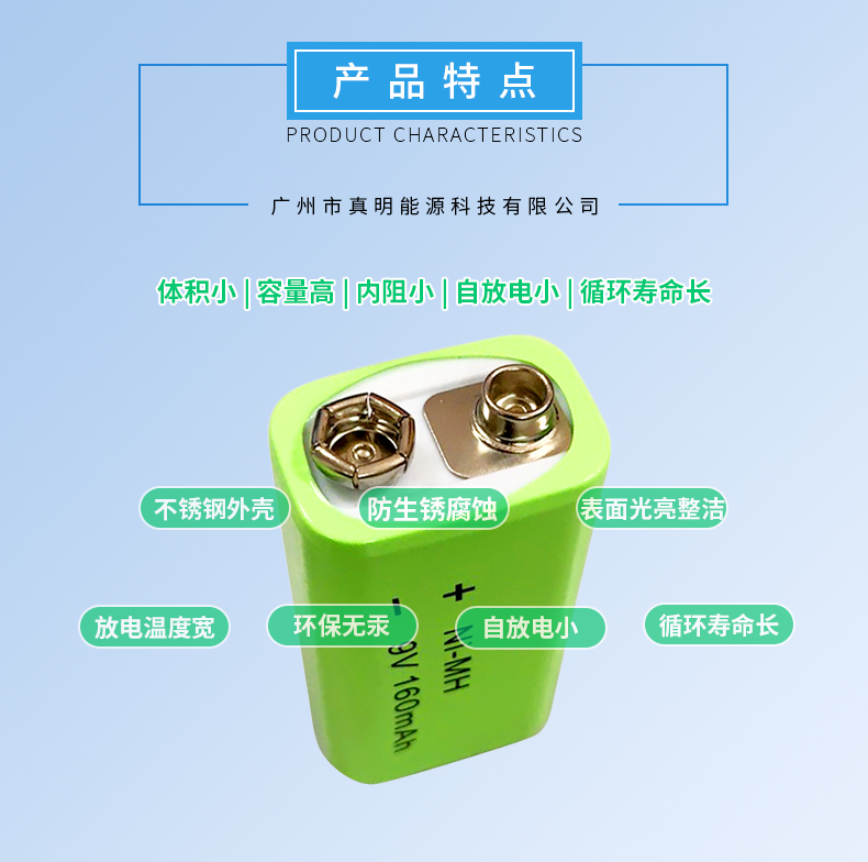 電池特點:可充電,循環壽命長;可代替一次性電池6F22、6LR61;環保性能好,無鎘無汞,無污染。