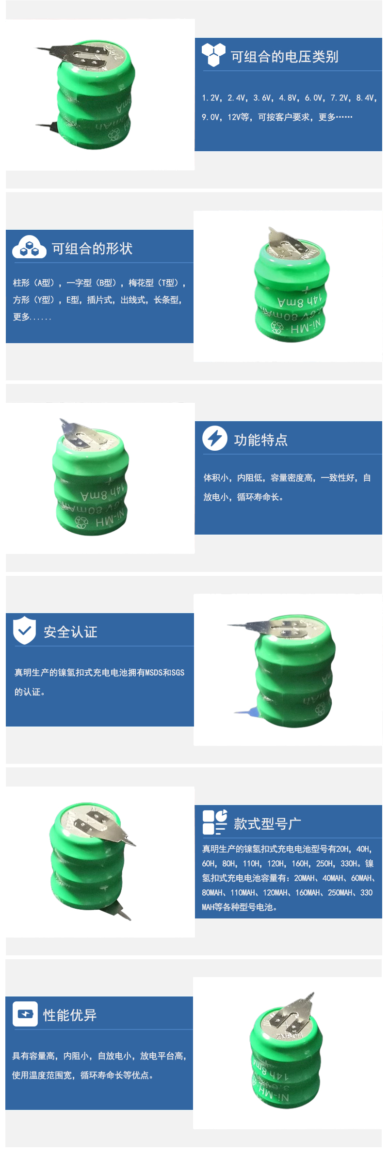 可串聯組合不同電壓:如2.4V、3.6V、4.8v、6.0V、7.2V、8.4V、9.0V、12V等