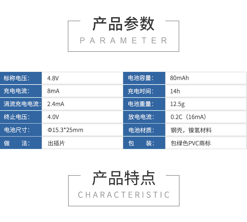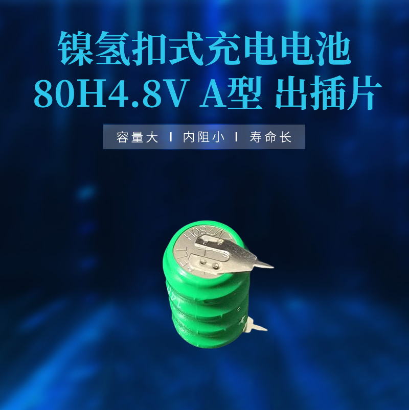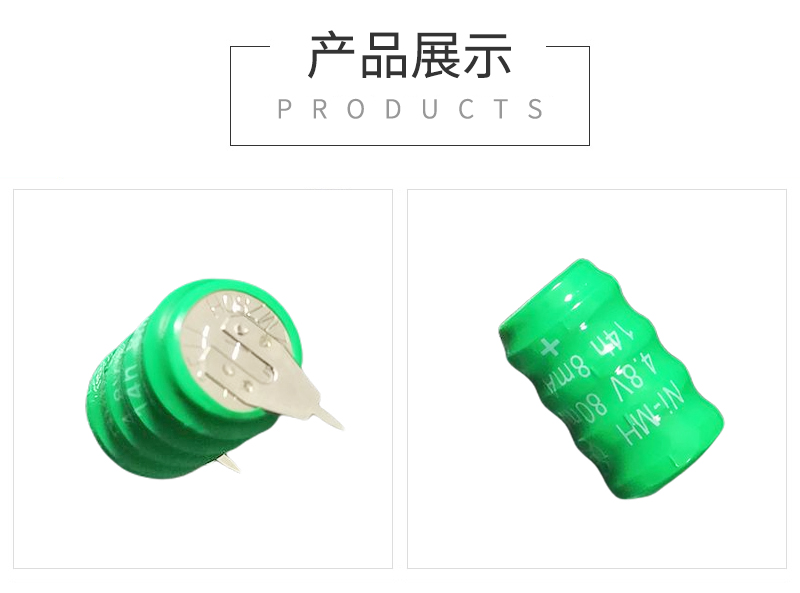 80H 4.8V帶腳鎳氫扣式電池是由4個(gè)80H扣式鎳氫電池層疊串聯(lián)組合而成的柱形鎳氫充電電池,其電壓為4.8V,容量80mAh,可根據(jù)客戶要求提供個(gè)性化定制加工。