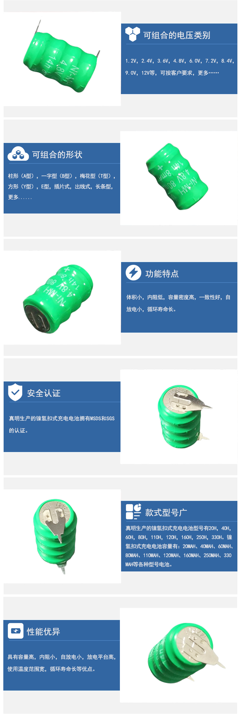 可串聯(lián)組合不同電壓:如2.4V、3.6V、4.8v、6.0V、7.2V、8.4V、9.0V、12V等