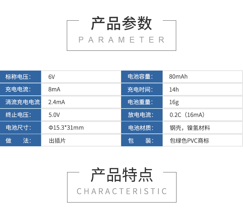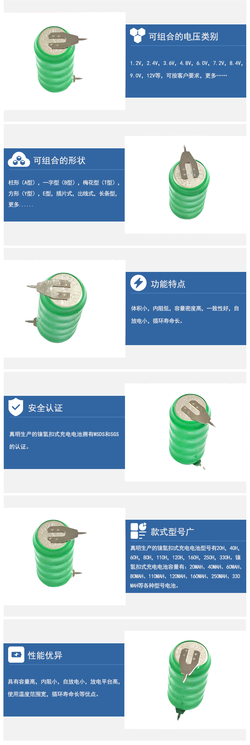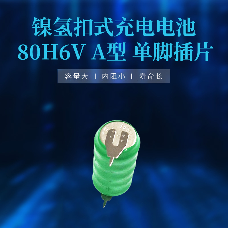 80H 6V帶腳鎳氫扣式電池是由5個80H扣式鎳氫電池層疊串聯組合而成的柱形鎳氫充電電池,其電壓為6V,容量80mAh,可根據客戶要求提供個性化定制加工。