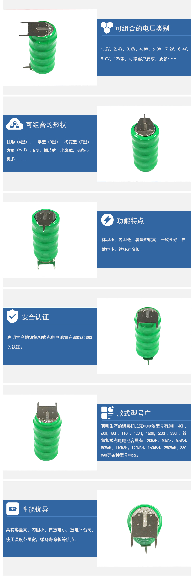 80H 6V帶腳鎳氫扣式電池是由5個80H扣式鎳氫電池層疊串聯組合而成的柱形鎳氫充電電池,其電壓為6V,容量80mAh,可根據客戶要求提供個性化定制加工。