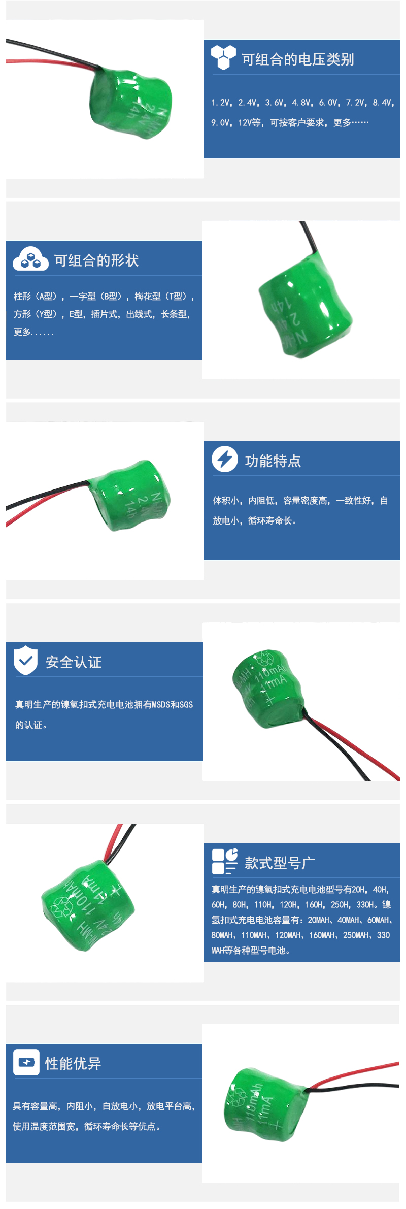 可串聯(lián)組合不同電壓:如2.4V、3.6V、4.8v、6.0V、7.2V、8.4V、9.0V、12V等