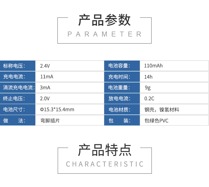 110H 2.4V帶線鎳氫扣式電池是由2個(gè)110H扣式鎳氫電池層疊串聯(lián)組成而成的柱形鎳氫充電電池,其電壓為2.4V,容量20mAh,可根據(jù)客戶要求提供個(gè)性化定制加工。
