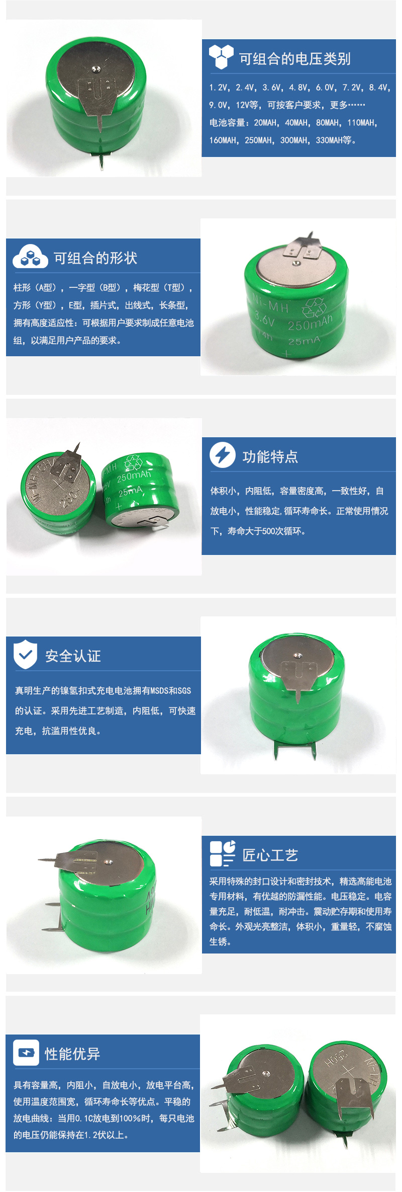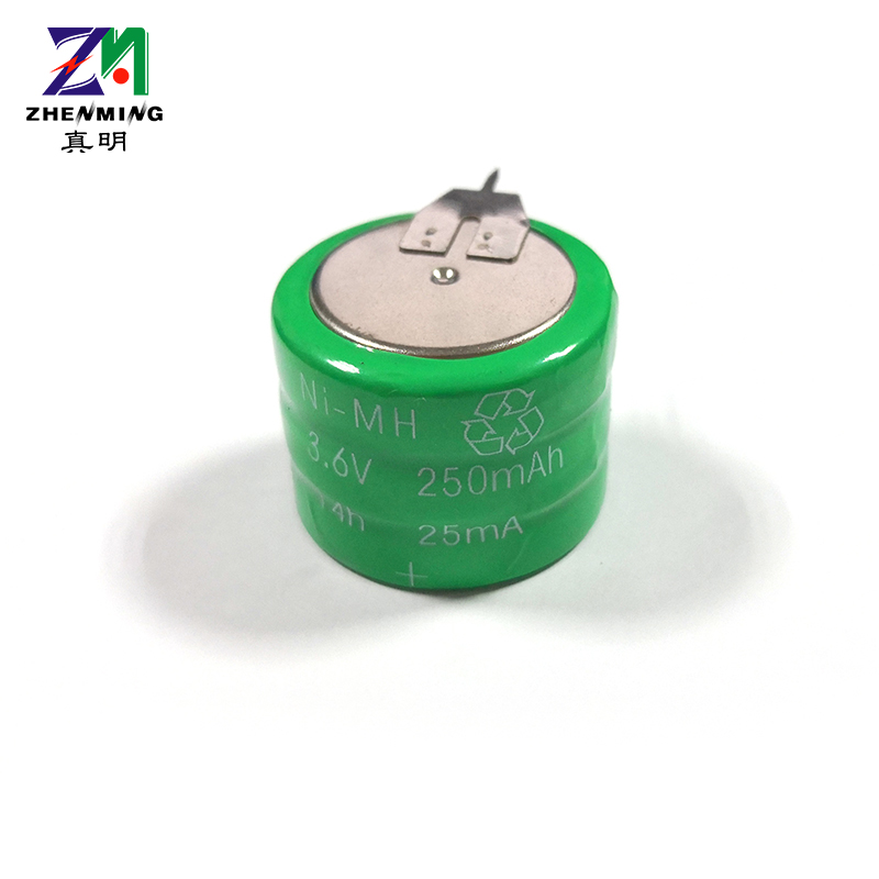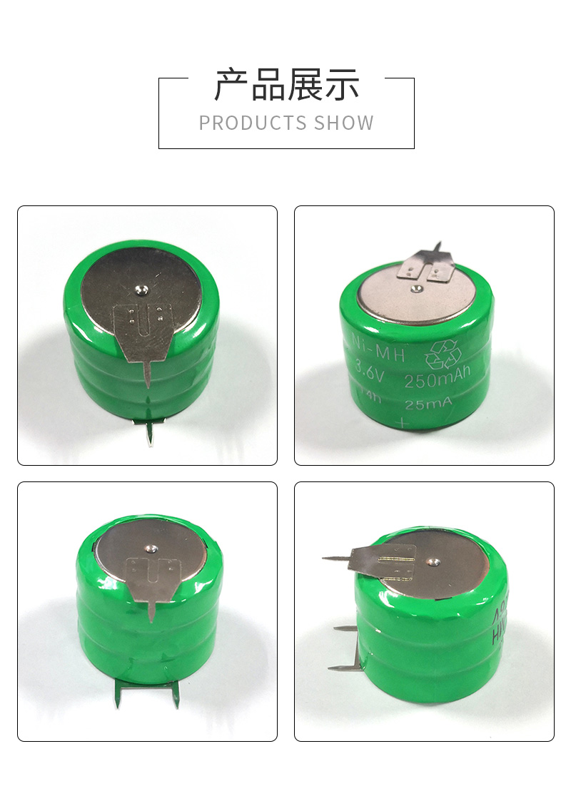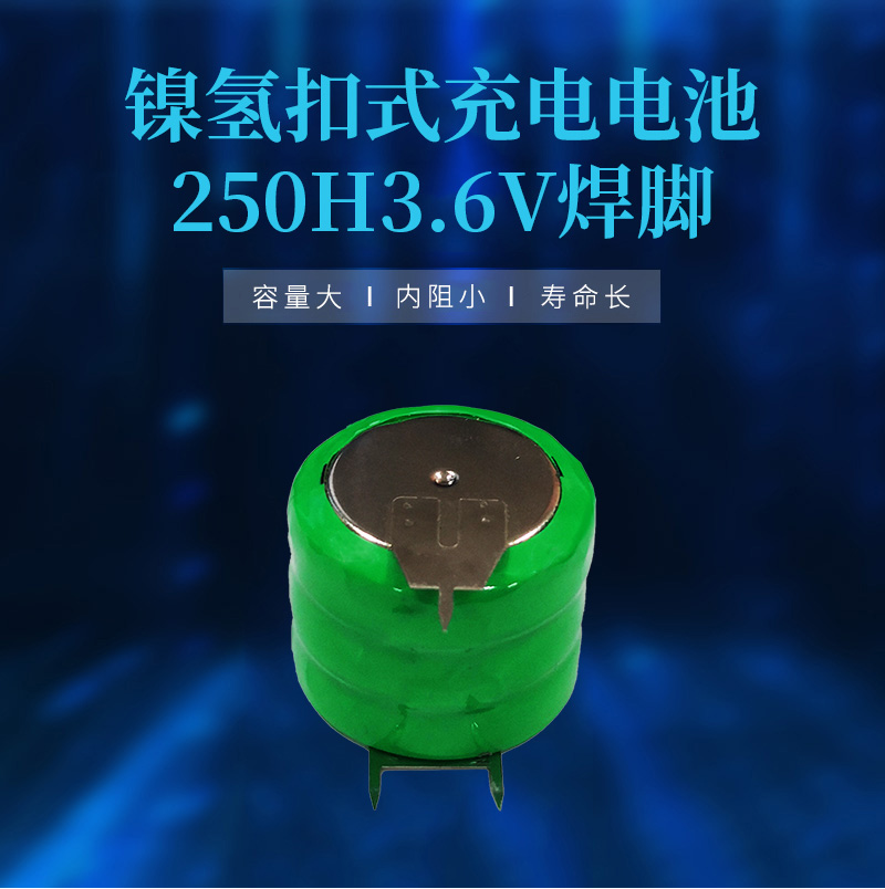 250H 3.6V帶腳鎳氫扣式電池是由3個250H扣式鎳氫電池層疊串聯組合而成的柱形鎳氫充電電池,其電壓為3.6V,容量250mAh,可根據客戶要求提供個性化定制加工。