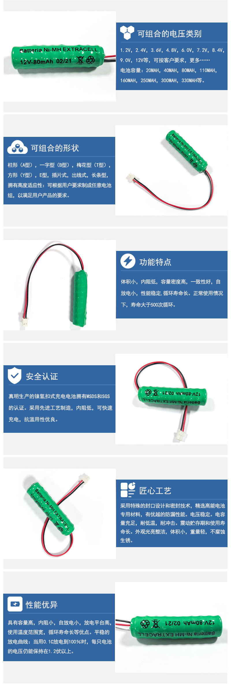 可串聯(lián)組合不同電壓:如2.4V、3.6V、4.8v、6.0V、7.2V、8.4V、9.0V、12V等